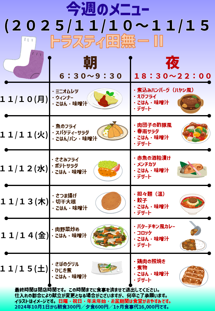 この11月11日(火)のトラスティ田無-Ⅱの夕食は、赤魚の酒粕漬け、メンチカツ、ごはんと味噌汁、デザートの予定です。