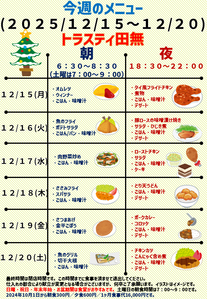 2025年12月30日(火)~2026年1月5日(月)まで年末年始休業ですので、2026年1月6日(火)から食堂と管理の営業を再開いたします。トラスティ田無-Ⅱとは休日が違いますのでご注意ください。どうぞよろしくお願いいたします。